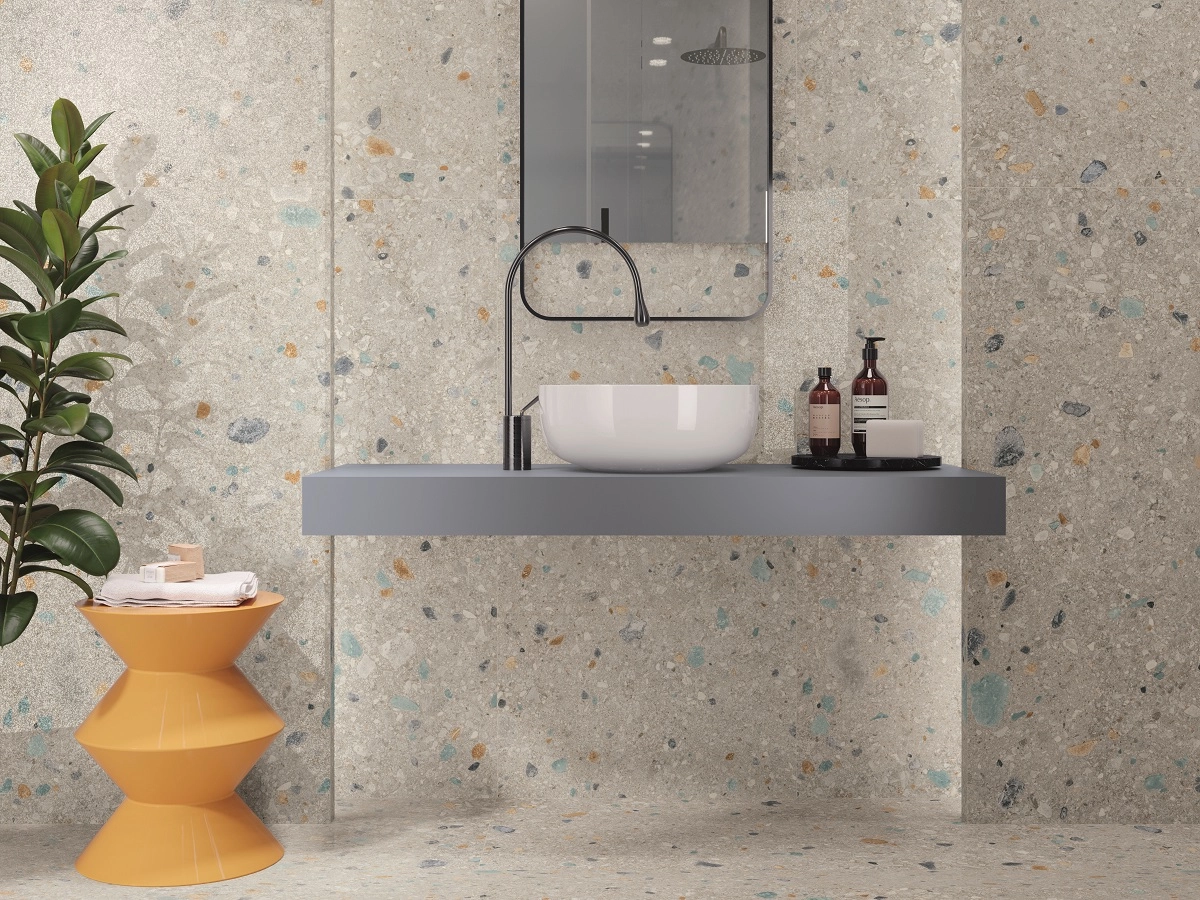 Основа дизайна серии – имитация мраморной крошки. Цветовая гамма выдержана в естественной серой и бежевой гамме с цветными вкраплениями.