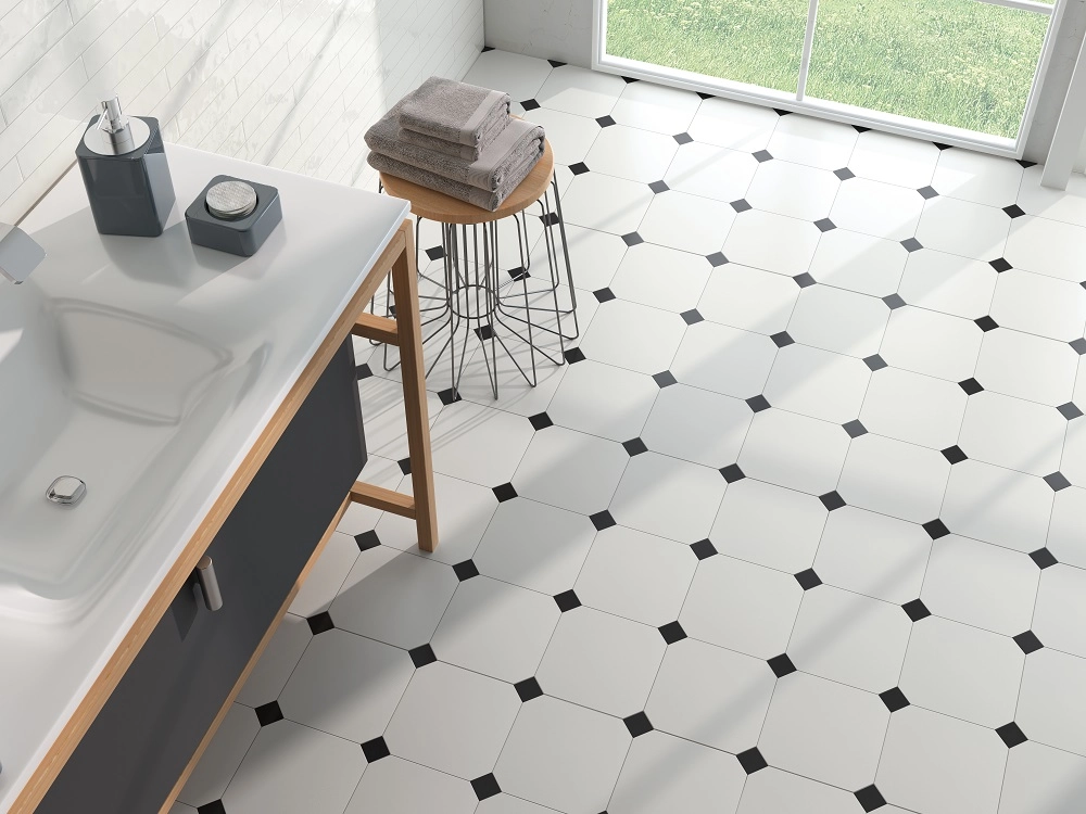 Керамогранит Ape Eight предназначен для укладки на пол или для оформления кухонного фартука. Плитку часто используют в ванной комнате, в гостиной или коридоре, на кухне. После укладки получается красивый узор из черно-белых октагонов и квадратов – идеальная картина для тех, кто любит минимализм в интерьере дома.