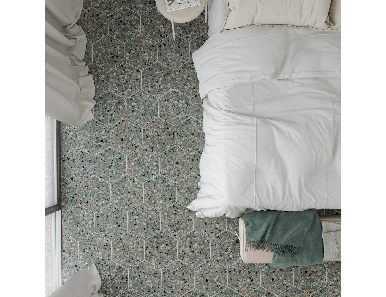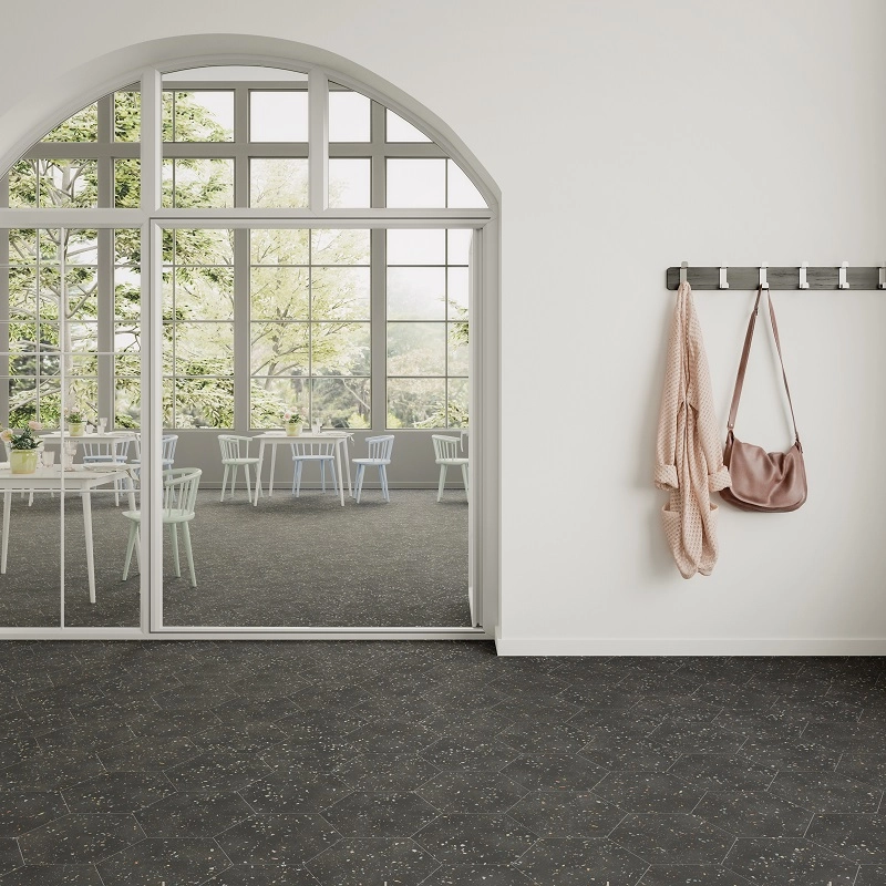 DNA Tiles Terazzo – это коллекция шестиугольных терраццо с матовой поверхностью. Материал имитирует разные типы терраццо, с различными включениями. Серия включает элементы, реализованные в следующих вариантах:
