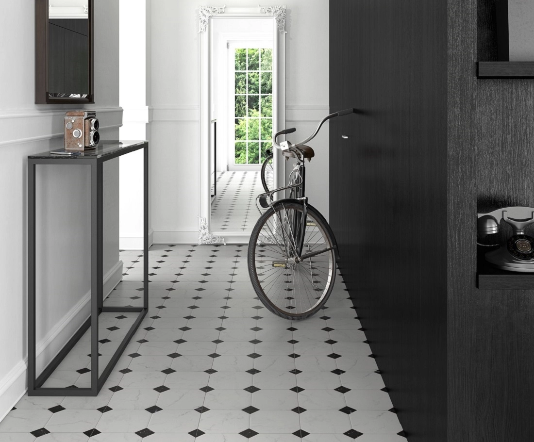 Матовая поверхность керамогранита обладает высокой износостойкостью и антискользящими свойствами, что подходит для пола в ванных комнатах, гостиных и других жилых помещениях. Благодаря своей прочности, коллекция также может применяться в общественных пространствах с высокой проходимостью. Коллекция Betera предлагает модели в двухцветных решениях, включая эффектные черно-белые сочетания.