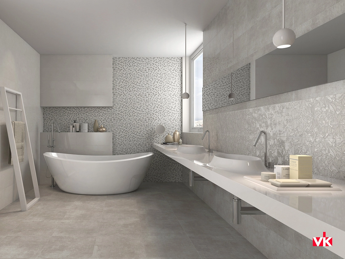 Настенная плитка выполнена в размере 250х700 мм, она дополняется декорами с цветочными орнаментами, под штукатурку, мозаику или с полосками. Для завершения укладки есть бордюры, напоминающие металлические профили, обрамляющие керамическую поверхность. Оформление пола в одном исполнении со стенами можно сделать плитами квадратной формы 450х450 мм.