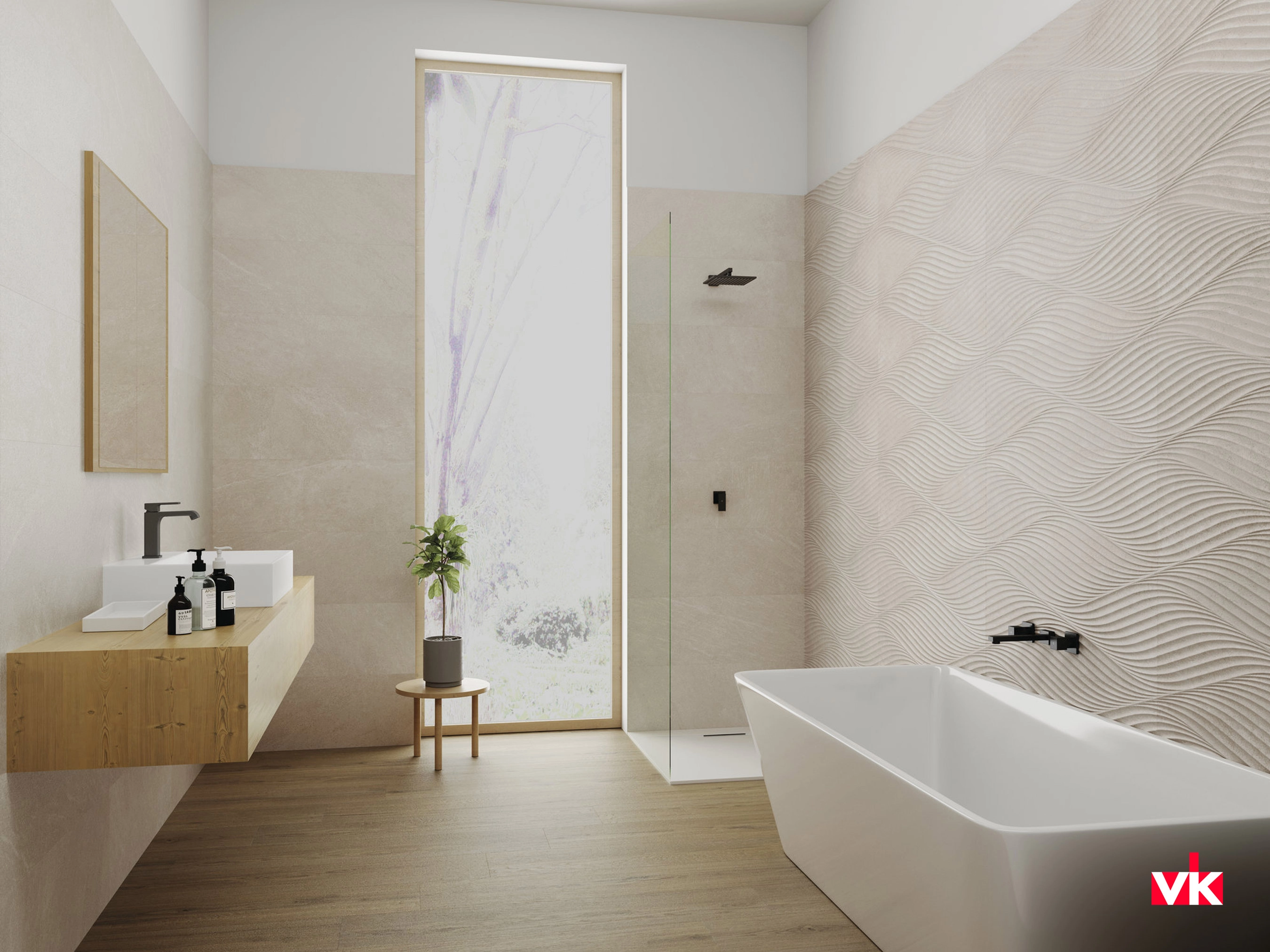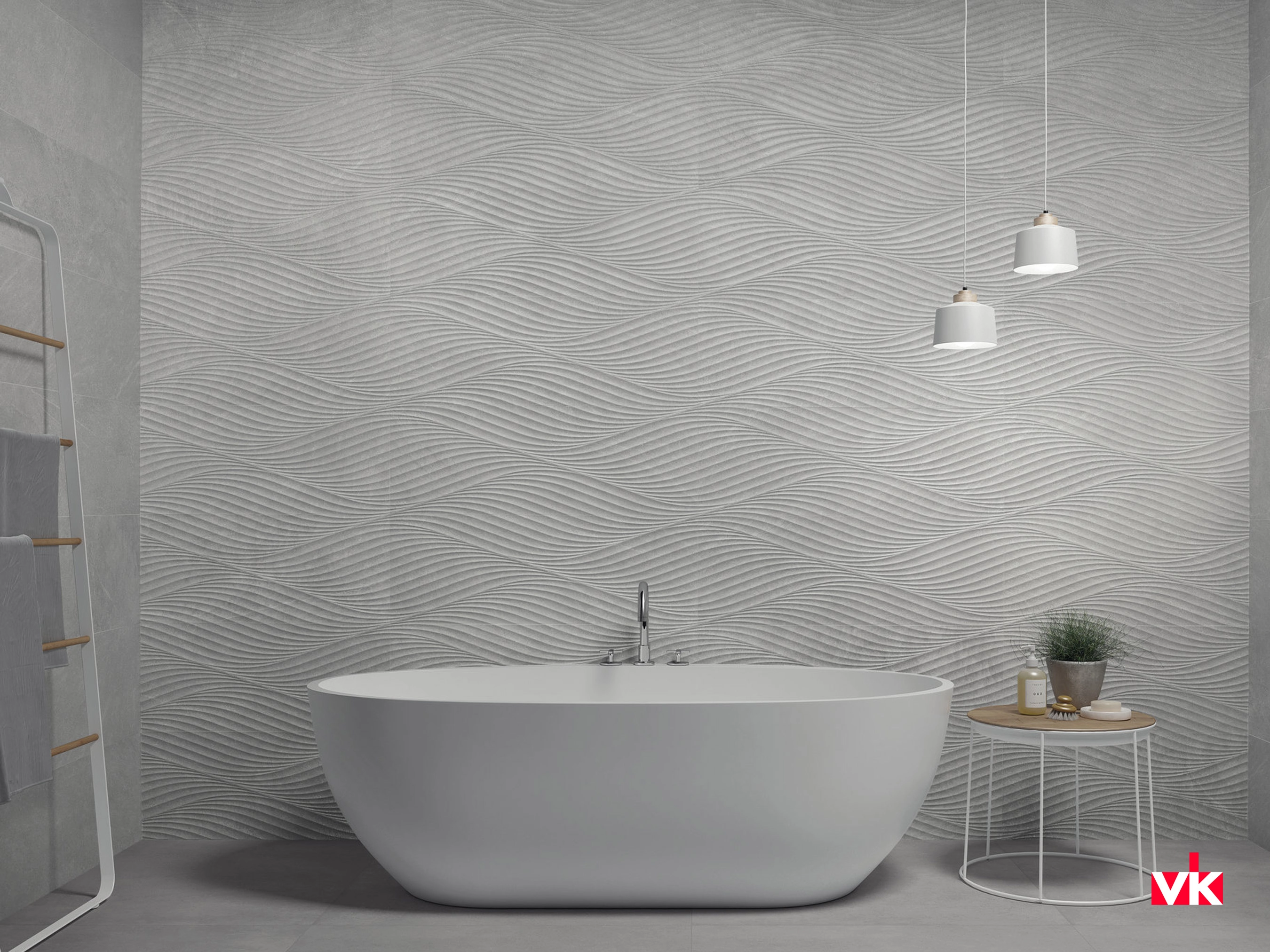 Декор имеет волнообразный узор, имитирующий 3D-эффект, благодаря чему помещение визуально воспринимается большим, его наполняет динамичность морской волны. Пастельные тона декора и его поверхность, которая напоминает песчаник и кальцит, создают воистину успокаивающий эффект.