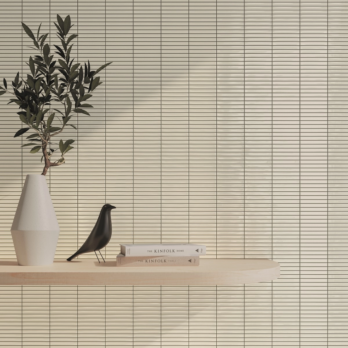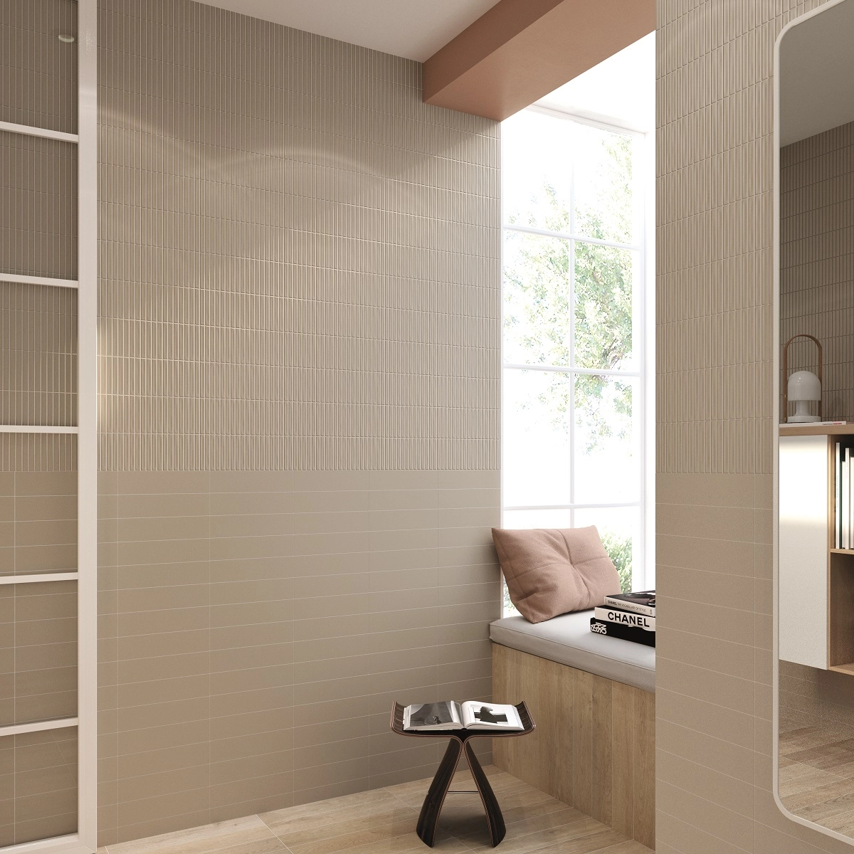 Коллекция плитки с глянцевым блеском для оформления фартуков на кухне, ванных комнат. Размер модулей 12,5х25 см. На каждом – рисунок из узких элементов с имитацией межплиточных швов – свежий и модный вариант мозаичного оформления стен.