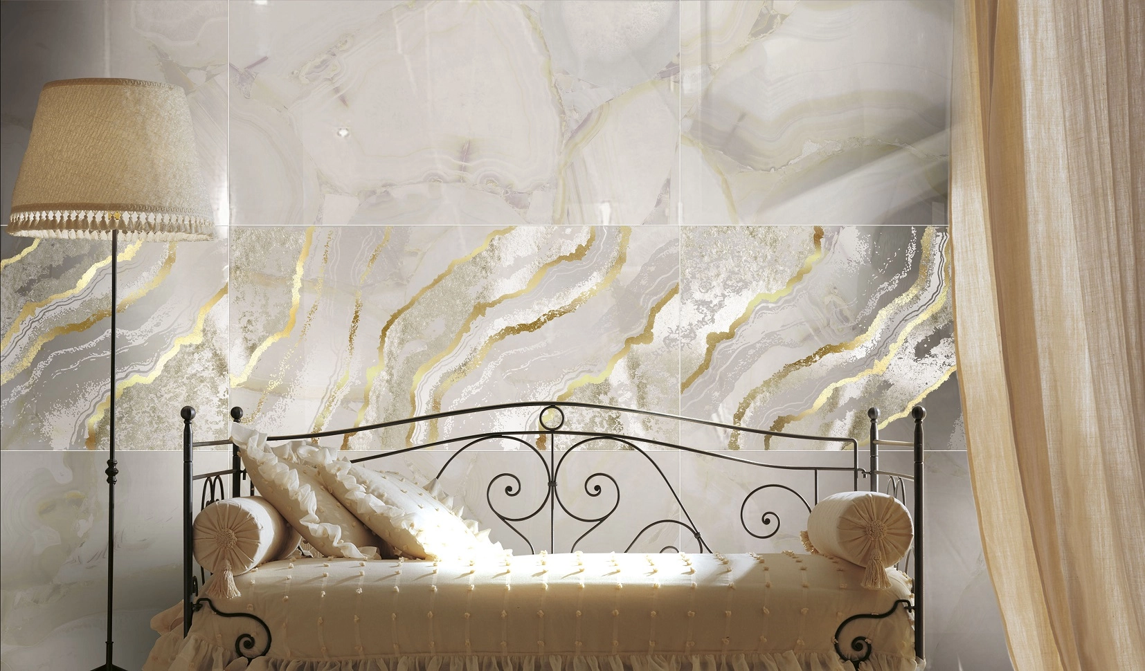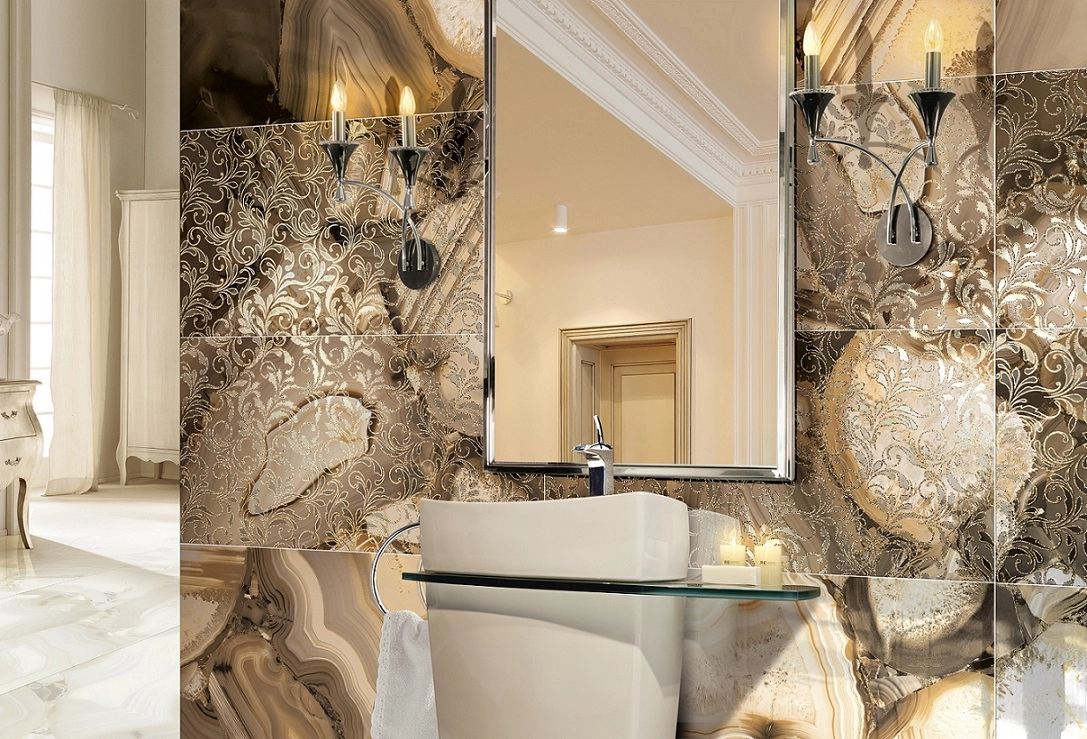 Плиткой Brennero Grandiosa можно выполнять отделку как стен, так и пола. Ее лаппатированная поверхность исключает скольжение даже, если на нее разлить воду, а также очень тонко выделяет текстуру. Визуально кажется, что материал сделан из натурального янтаря, нефрита или другого камня. Благодаря ректифицированным краям его можно укладывать с минимальным швом, что создает эффект непрерывности поверхности.