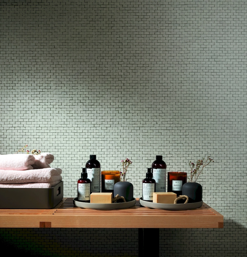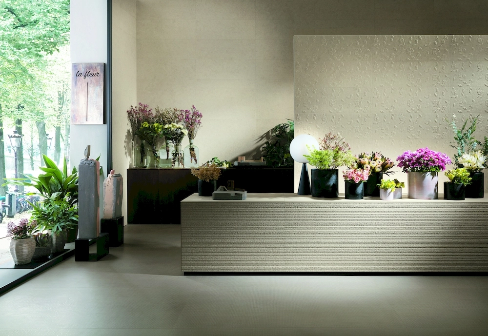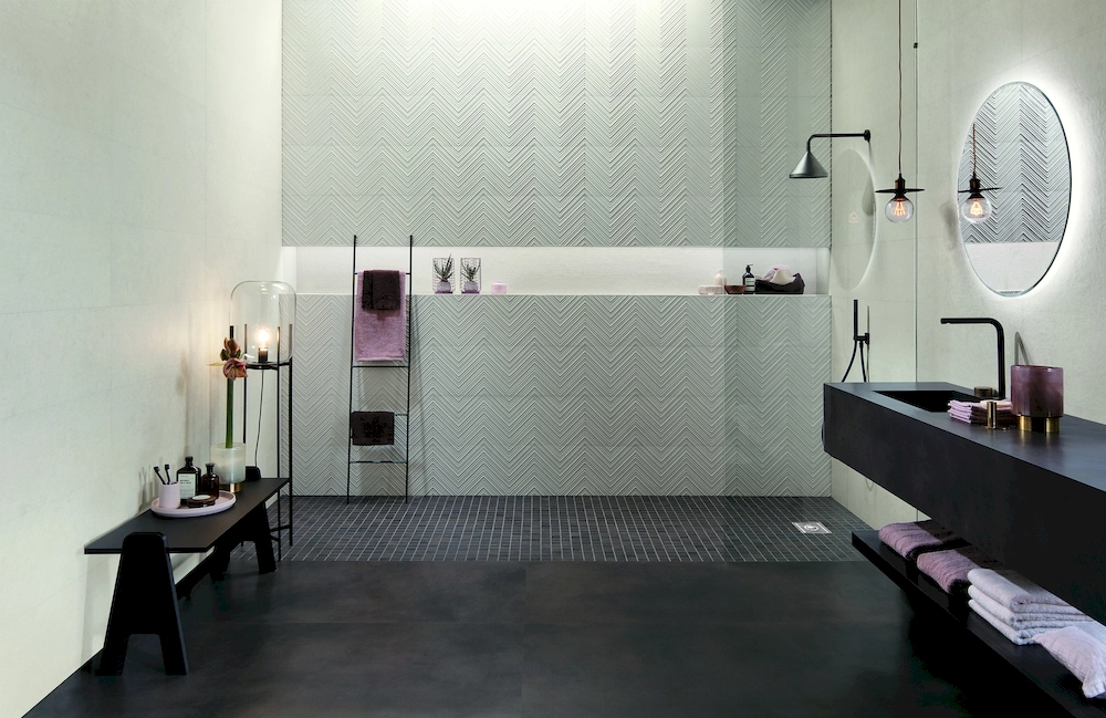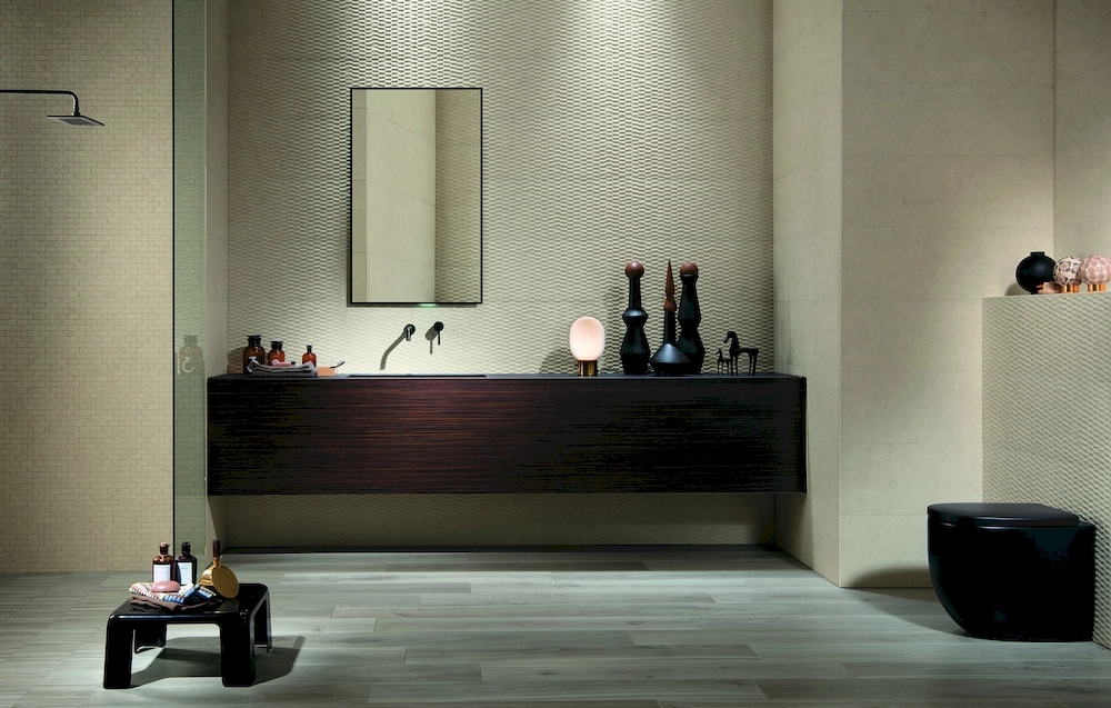 Базовая плитка керамики Fap Ceramiche предлагается в прямоугольном форм-факторе 305х915 мм, а декоры в квадратном 305х305 мм и в виде настенных фризов 15х915 мм. Ее поверхность матовая с имитацией песка, цемента и бетона. Окрашивается плитка в несколько цветов: