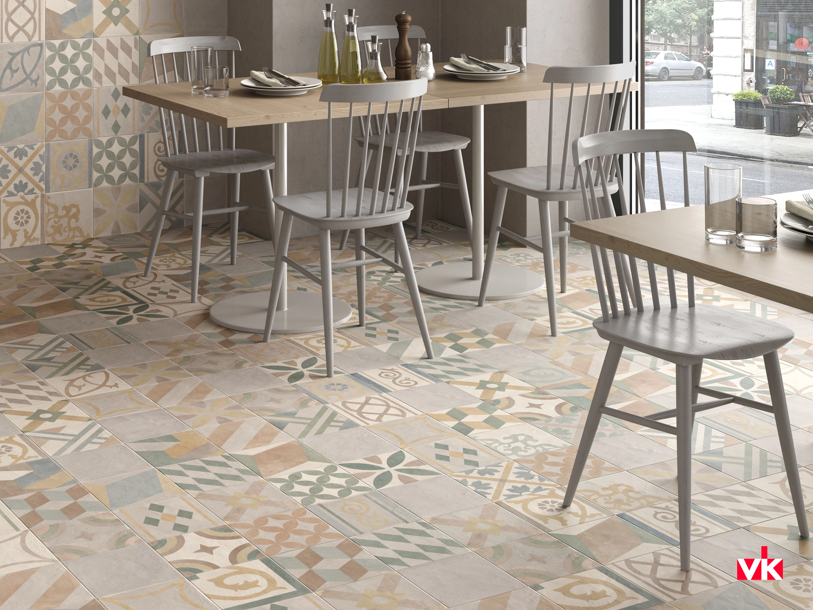 Палитру основной плитки дополняют декоры в виде квадратов и ромбов в прохладных оттенках, а также квадратов с различными графическими узорами.
