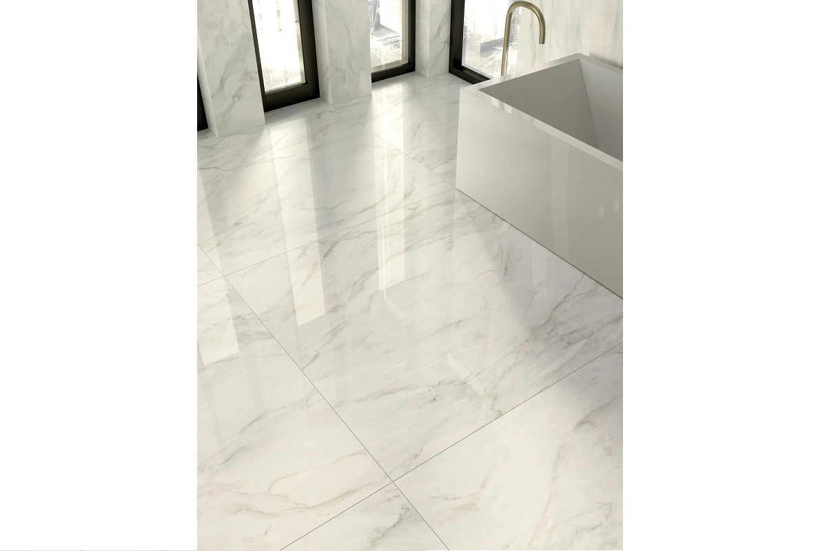 Полированный керамогранит для пола и стен с имитацией мраморной поверхности в крупном формате (60х120/119,5 см). Классический вариант для создания престижного, дорогого интерьера.