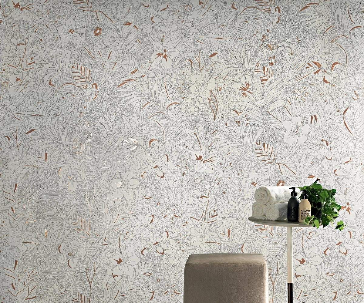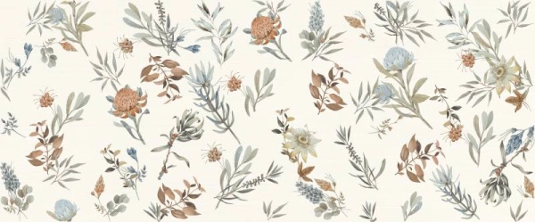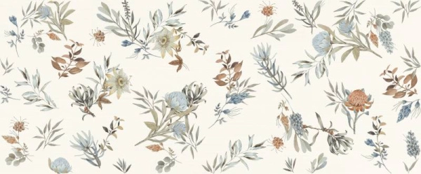В этой серии настенной плитки прямоугольные модули в размере 50х120 см с матовой поверхностью. Серия представлена нейтральным однотонным модулем цвета слоновой кости, остальная часть колллекции – природные мотивы в различных прочтениях. Здесь легкие акварельные эскизы, изящные графичные наброски, реалистичные изображения листьев и цветов в пастельных тонах. Такая концепция рисунка позволяет создать стильный эффект обоев в ванной комнате.