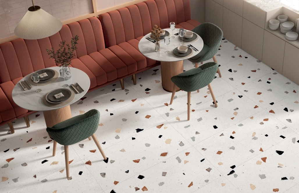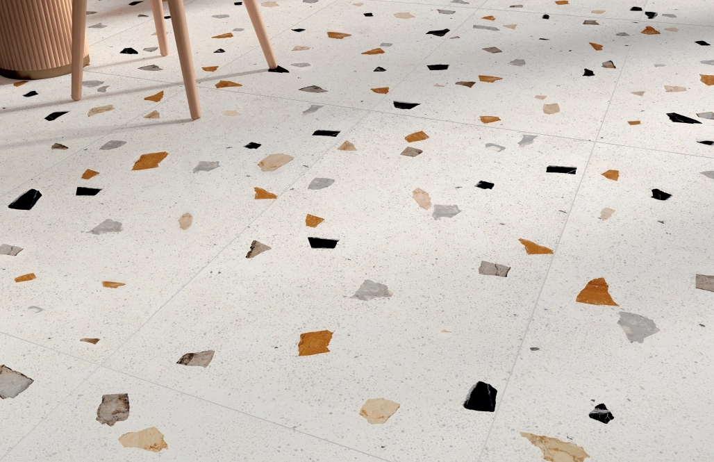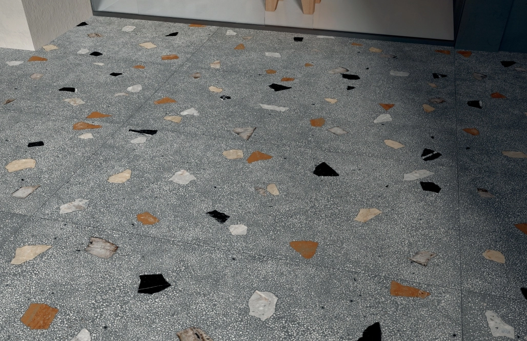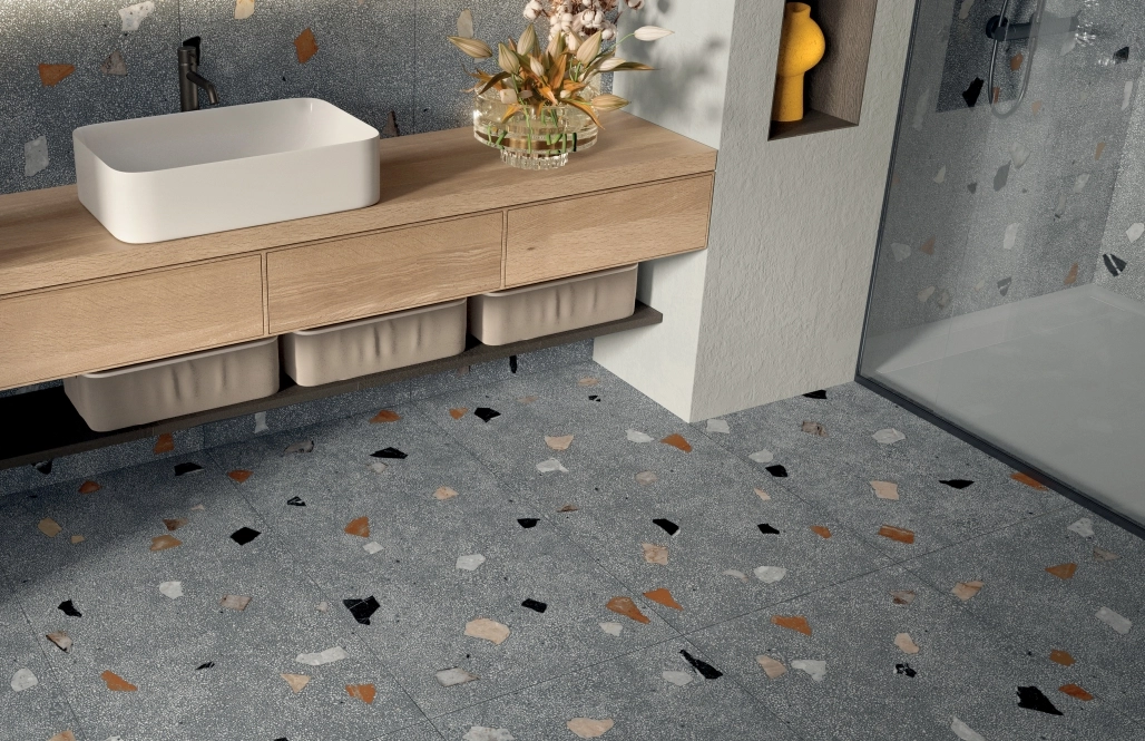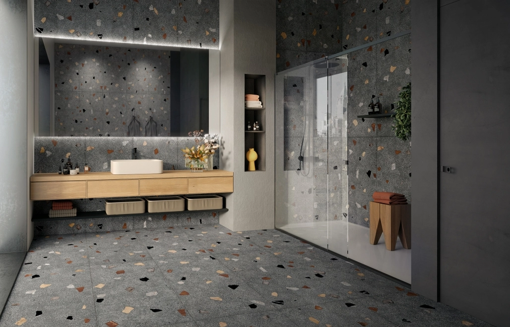 Коллекция керамогранита для отделки стен и пола в ванных комнатах, кафе, других общественных помещениях. Модули выпускаются в размере 60х120 см. Матовая поверхность имитирует натуральную текстуру темно-серого или белого камня с цветными вкраплениями более крупных элементов. Их случайное распределение оживляет интерьер, добавляя в него нотку творческого беспорядка.