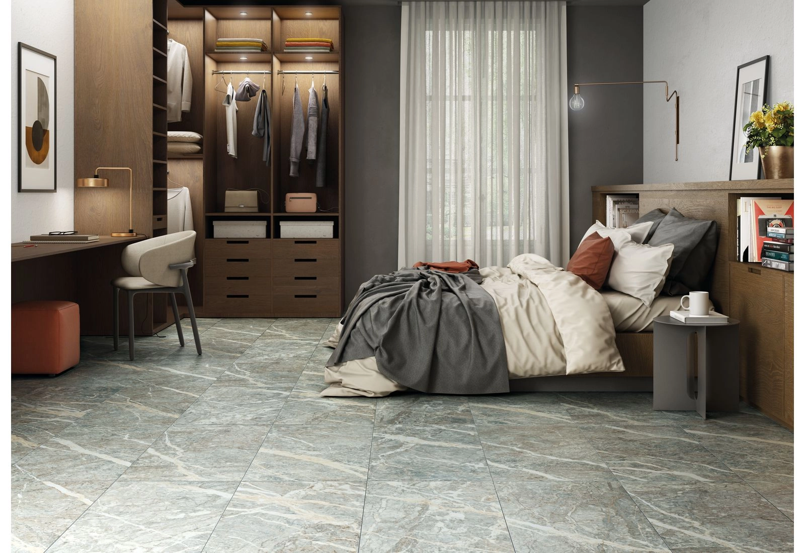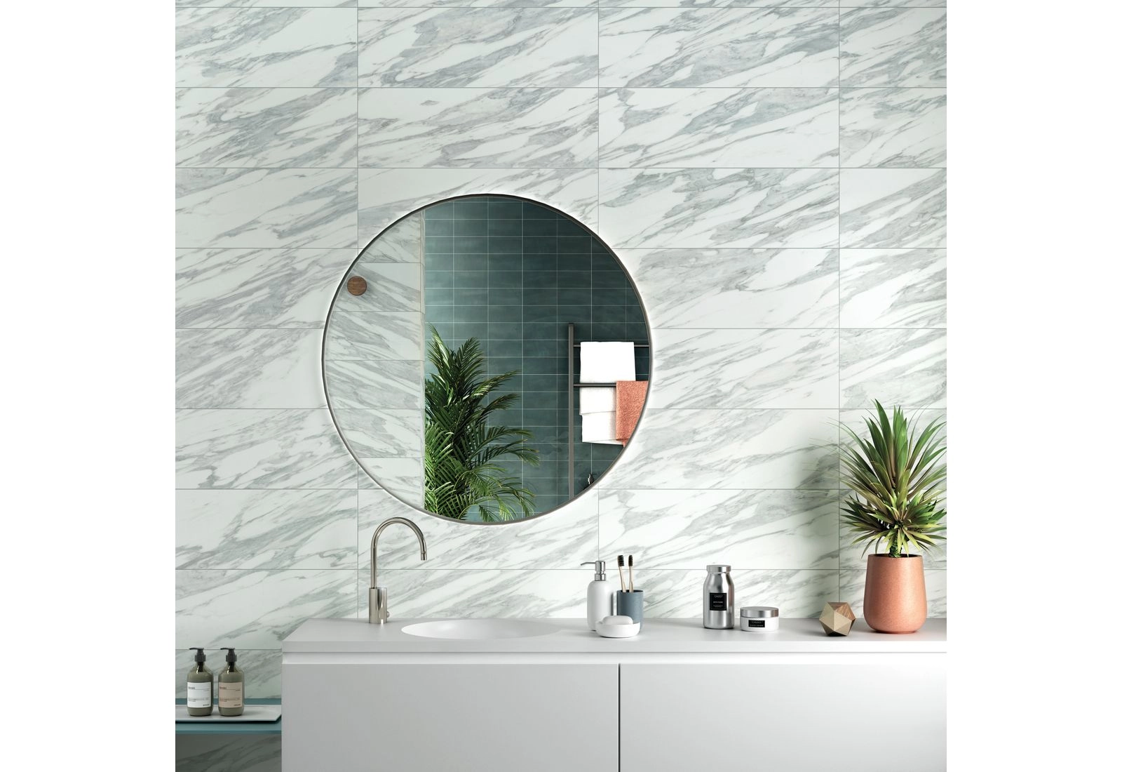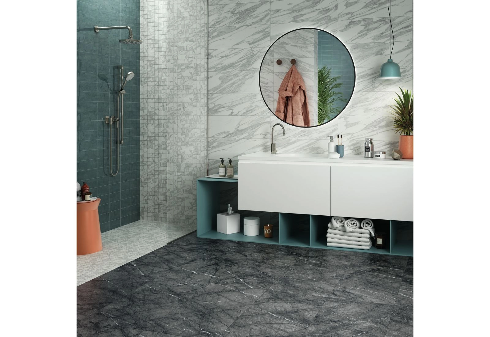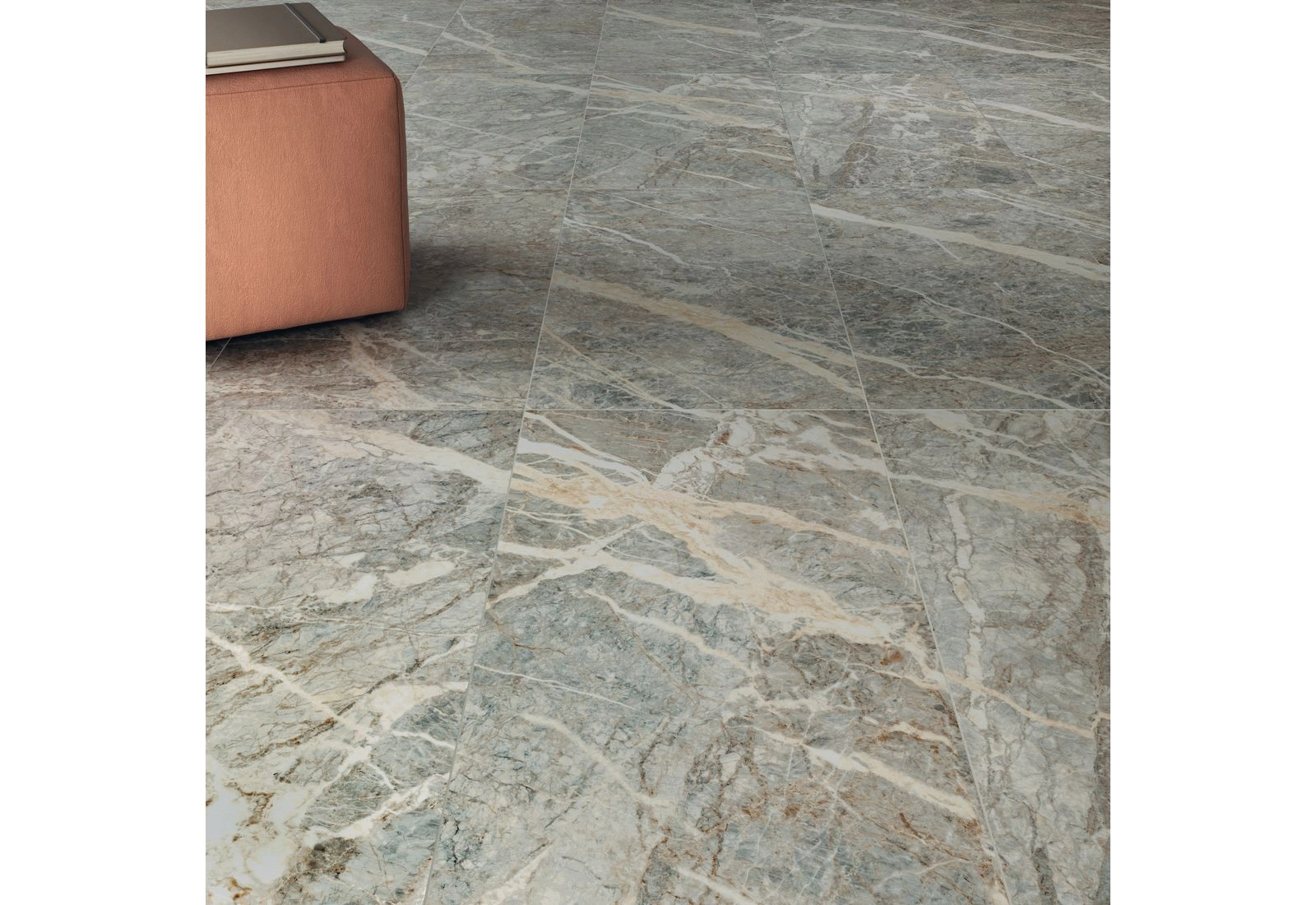 Поверхность плит матовая, она не скользит. Часто коллекцией оформляют ванные комнаты, санузлы, сауны, террасы и коридоры. Напольная плитка имеет ректифицированные края, поэтому, после укладки, она напоминает сплошной мраморный пласт. Разбавить мраморный узор можно декорами из мозаики, прямоугольных полос, монотонных элементов.