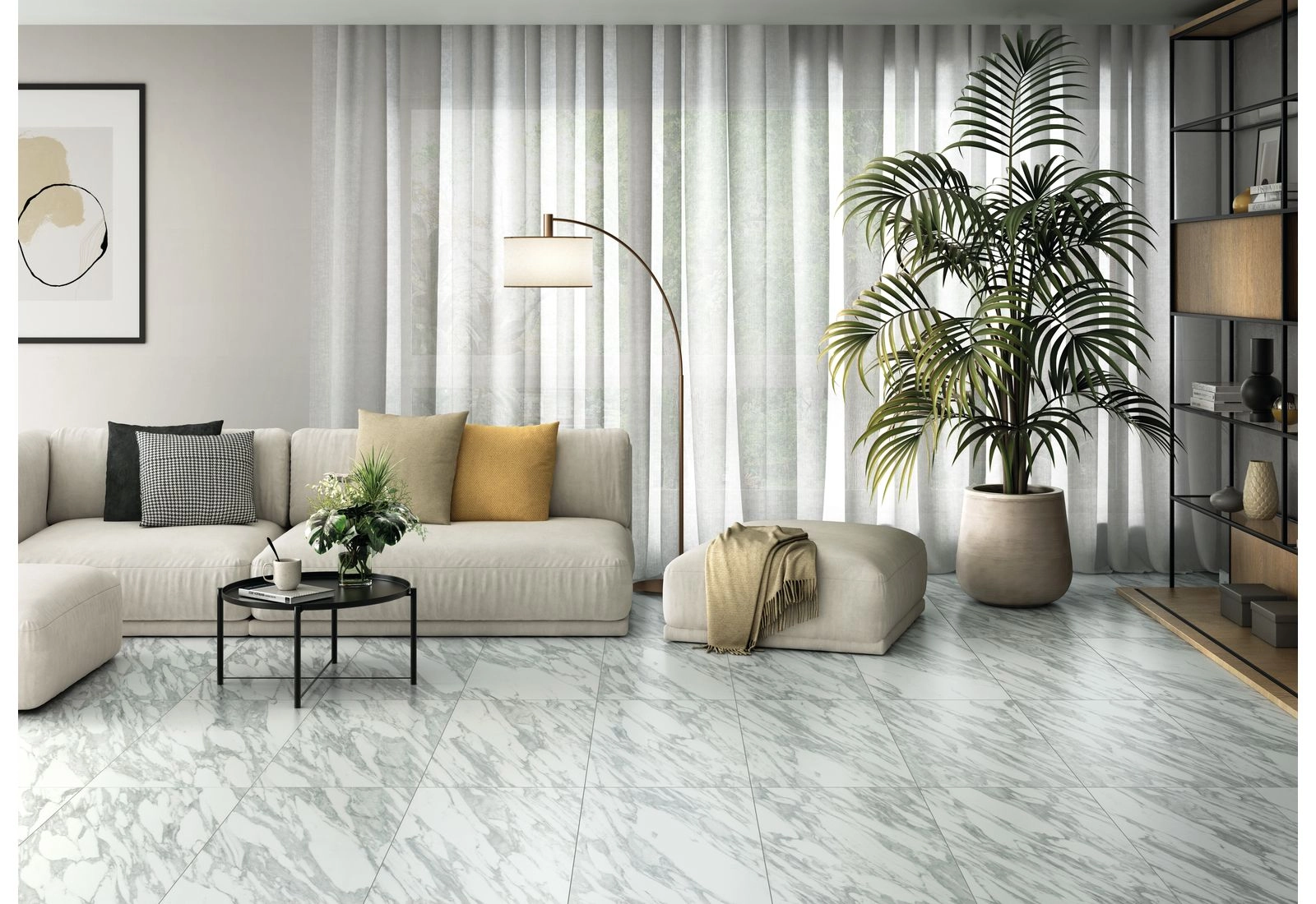 Coliseum Уффици – это российская коллекция керамогранита, имитирующего натуральный мрамор. Материал максимально точно передает всю фактуру натурального камня. Визуально сложно отличить, что на полу находится не плита, вырезанная с мрамора, а обычная керамогранитная плитка.