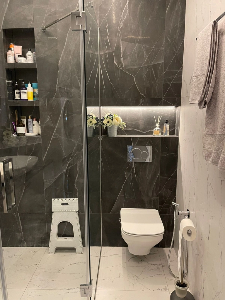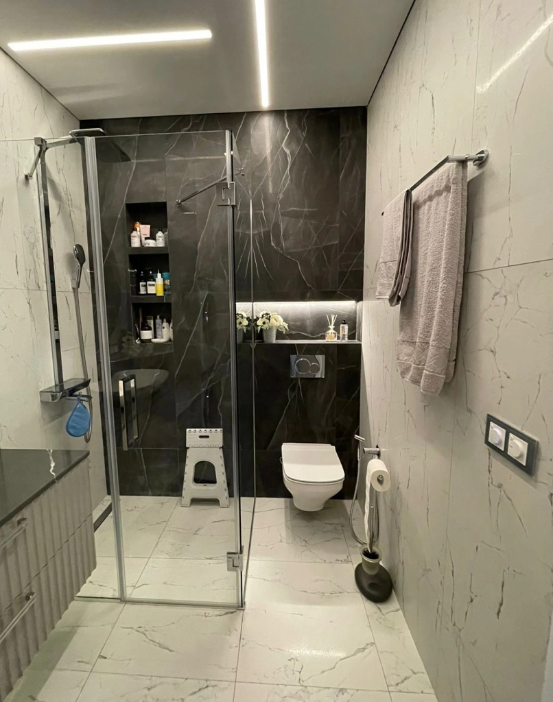 Проект реализован с использованием лаппатированного керамогранита под мрамор из коллекции CityMarble