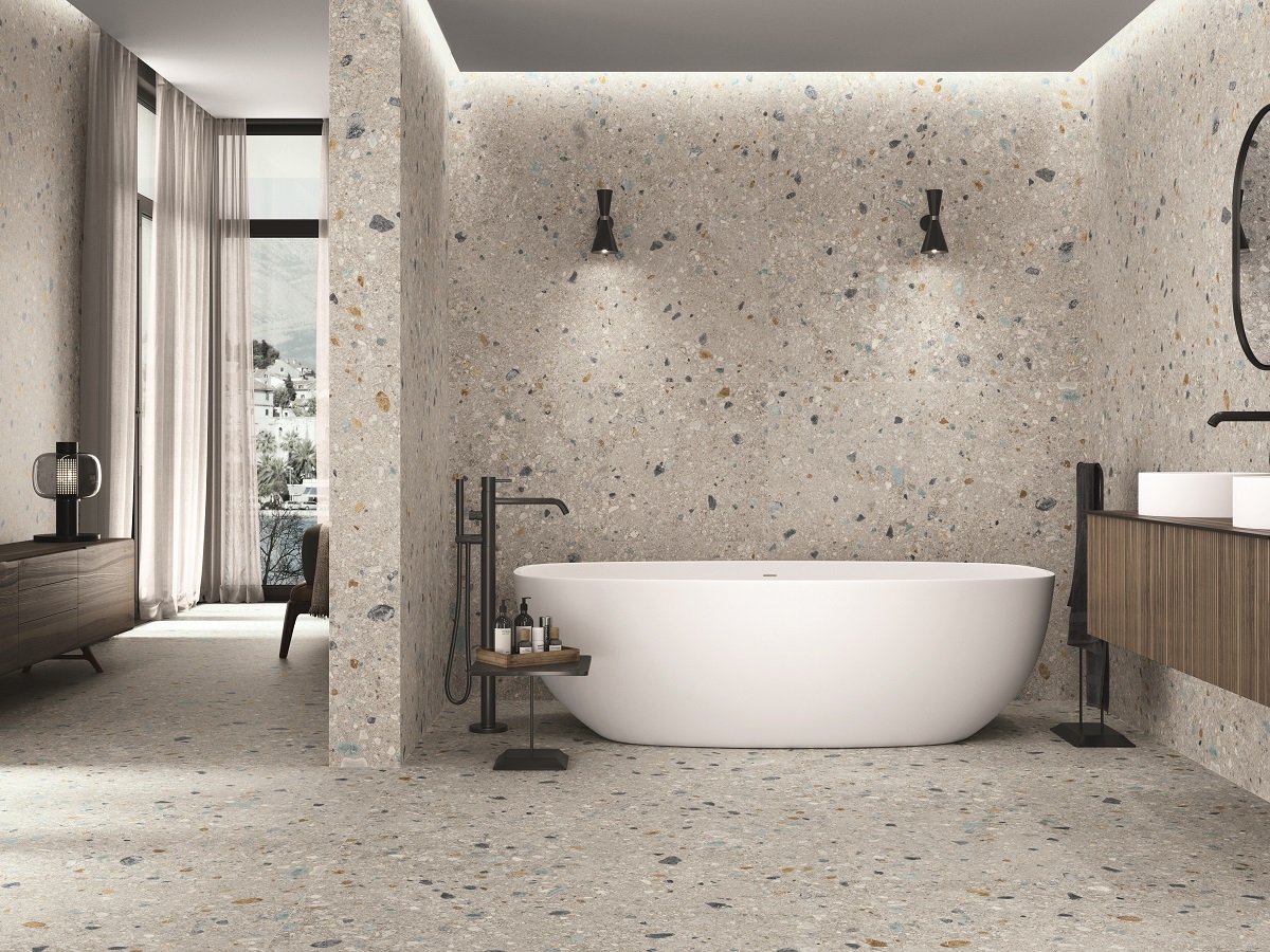 Основа дизайна серии – имитация мраморной крошки. Цветовая гамма выдержана в естественной серой и бежевой гамме с цветными вкраплениями.