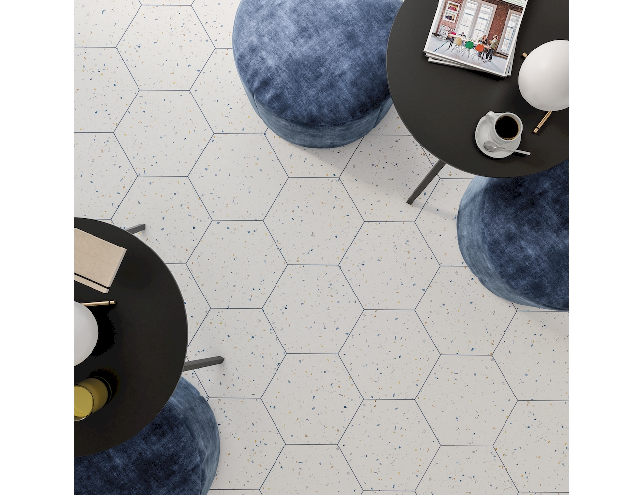 DNA Tiles Terazzo – это коллекция шестиугольных терраццо с матовой поверхностью. Материал имитирует разные типы терраццо, с различными включениями. Серия включает элементы, реализованные в следующих вариантах: