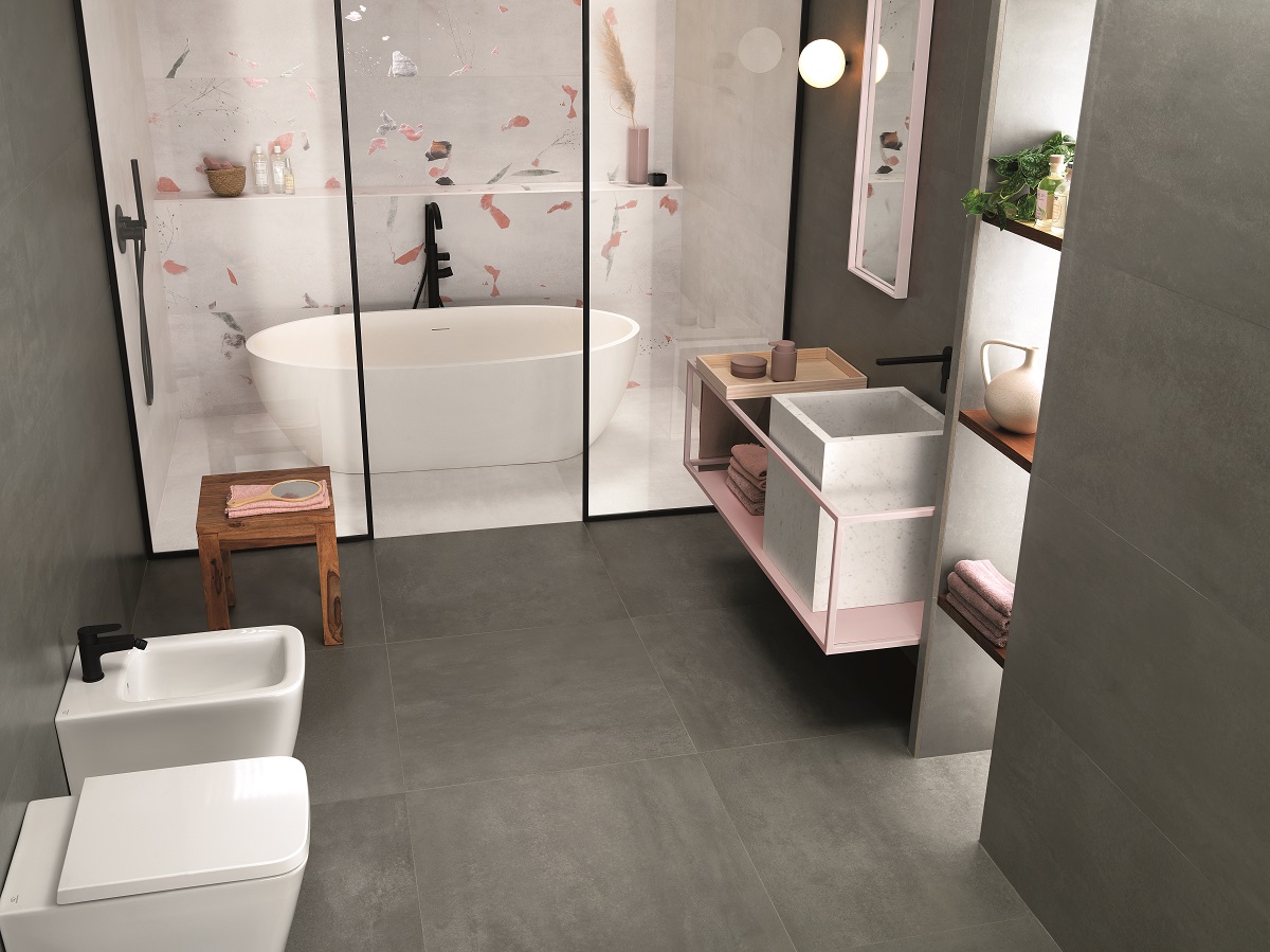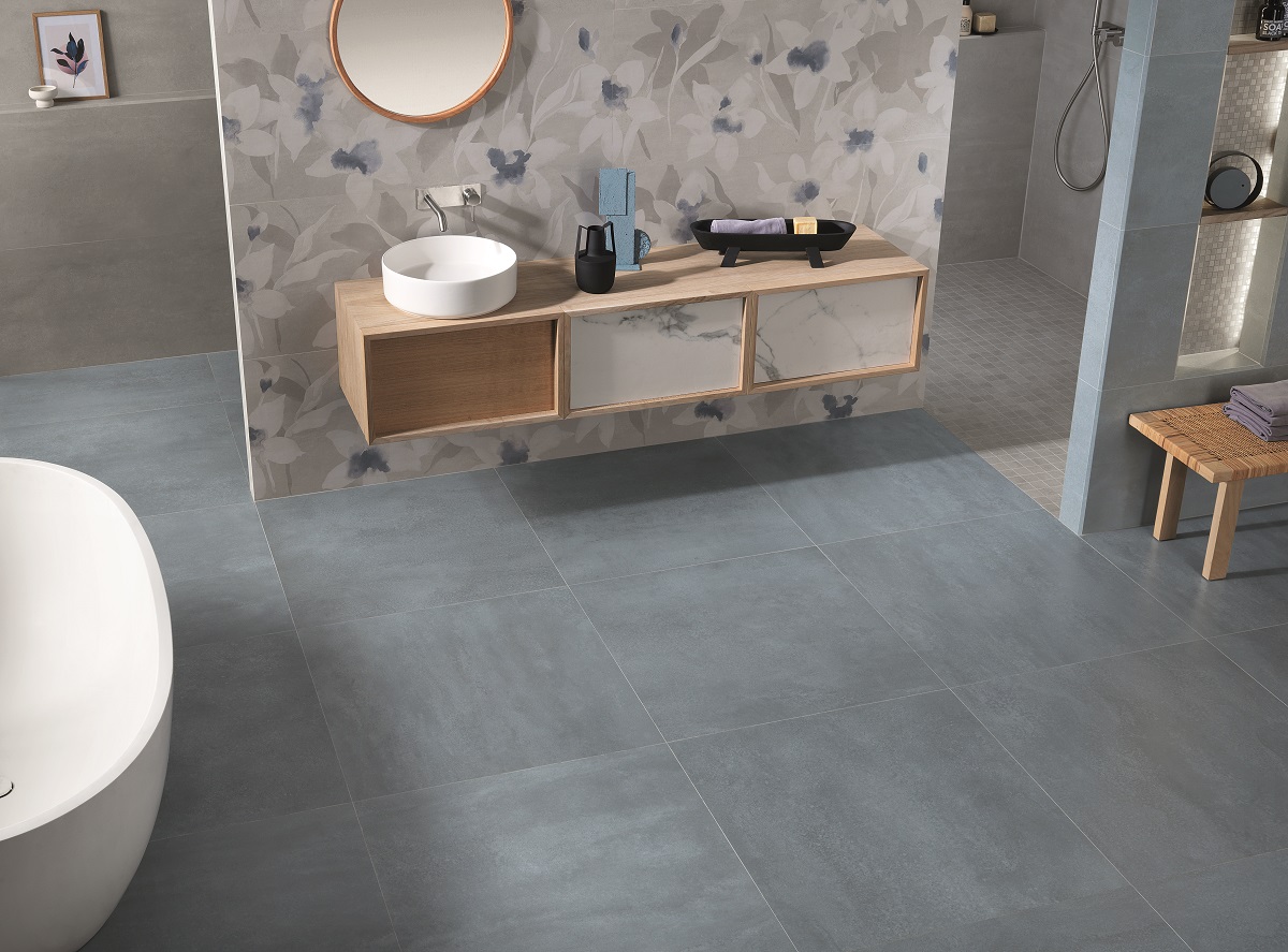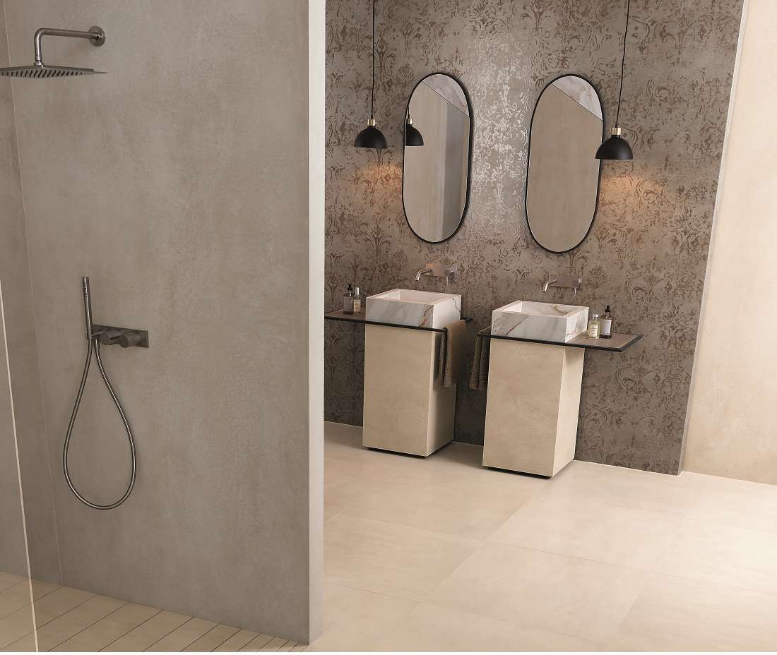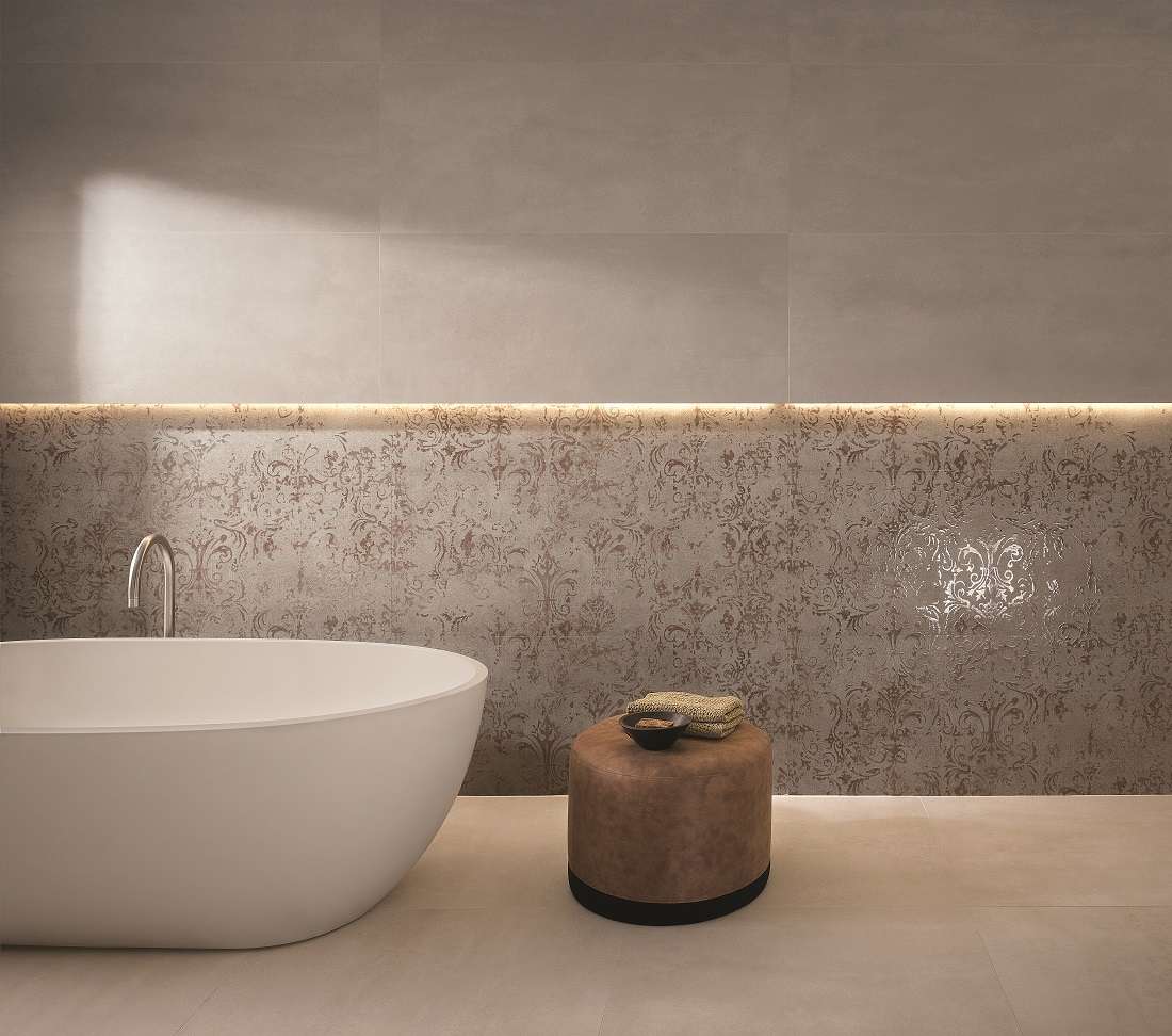 Разнообразная по наполнению серия керамической плитки и керамогранита. В коллекции квадратные (80х80 см) и прямоугольные (50х120 см) одноцветные модули для пола и стен в нейтральных базовых оттенках – бежевом, сером, кремовом.