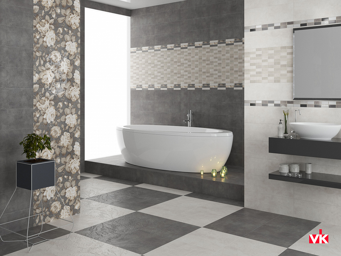 Современный мир дизайна без ума от серого цвета. Он ассоциируется с интеллектом и спокойствием, идеально сочетается с любыми другими цветами и создает умиротворяющую обстановку. Именно поэтому основу коллекции Фиори Гриджо (с итальянского «серые цветы») составляет благородный серый, играющий разнообразием текстур и оттенков. В качестве фона выбрана имитация поверхности бетона, представленная в двух оттенках. Декор с изображением нежных роз создает неожиданный контраст с индустриальной суровостью базовой плитки. Дополнения в виде мозаики и бордюра с эффектом металлизированного покрытия придают визуальный акцент выдержанному в серых тонах интерьеру. Мозаика является значимой частью этой коллекции: тут и два вида настенной плиты с имитацией мозаики, и натуральная мозаика оригинальной формы, и даже напольная мозаика из керамогранита, которую можно использовать как на стене, так и на полу.