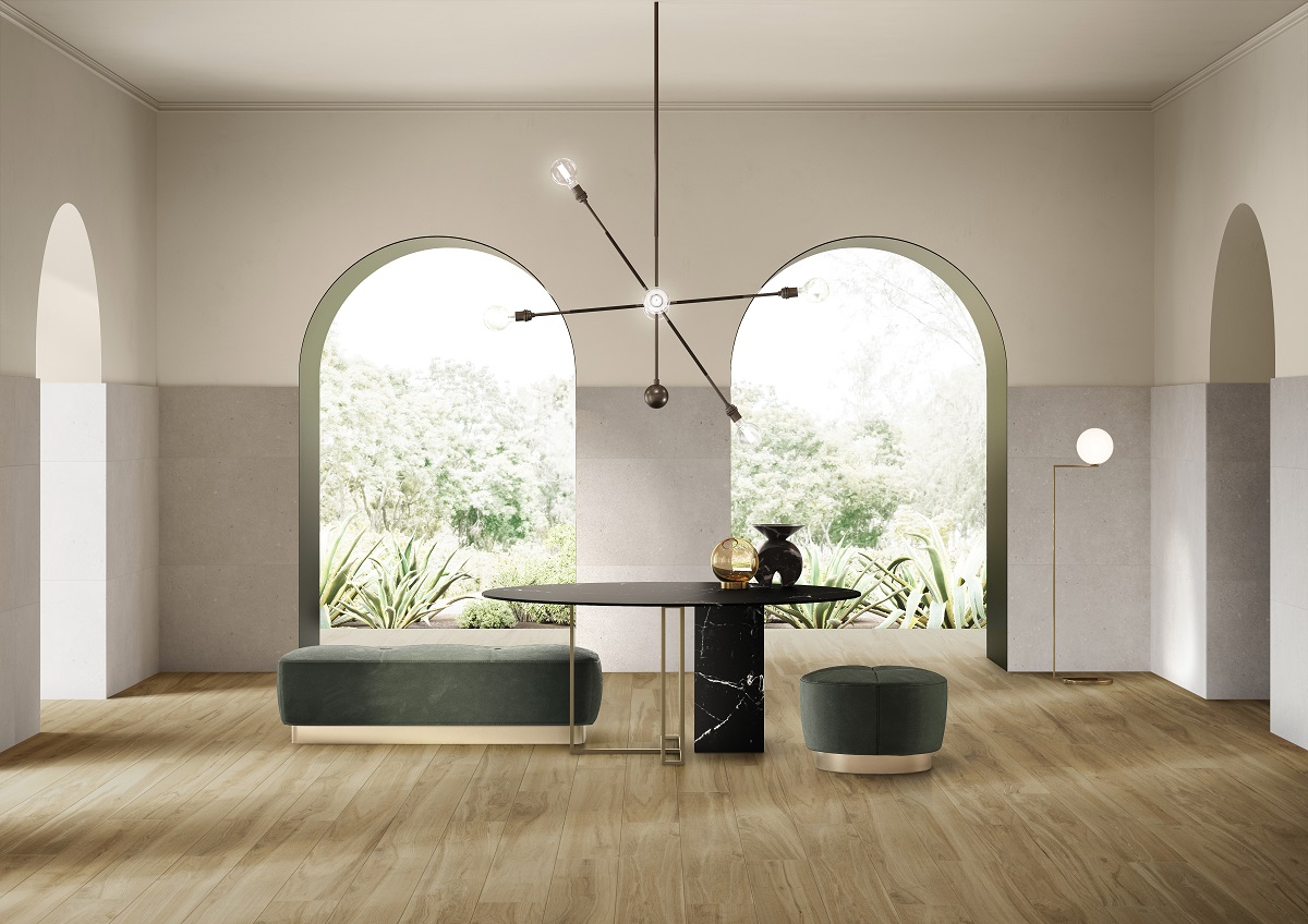 Серия матовой напольной керамической плитки фабрики Витра представлена двумя вариантами модулей – имитация натурального дерева в бежевом оттенке и венге размером 120х20 см.